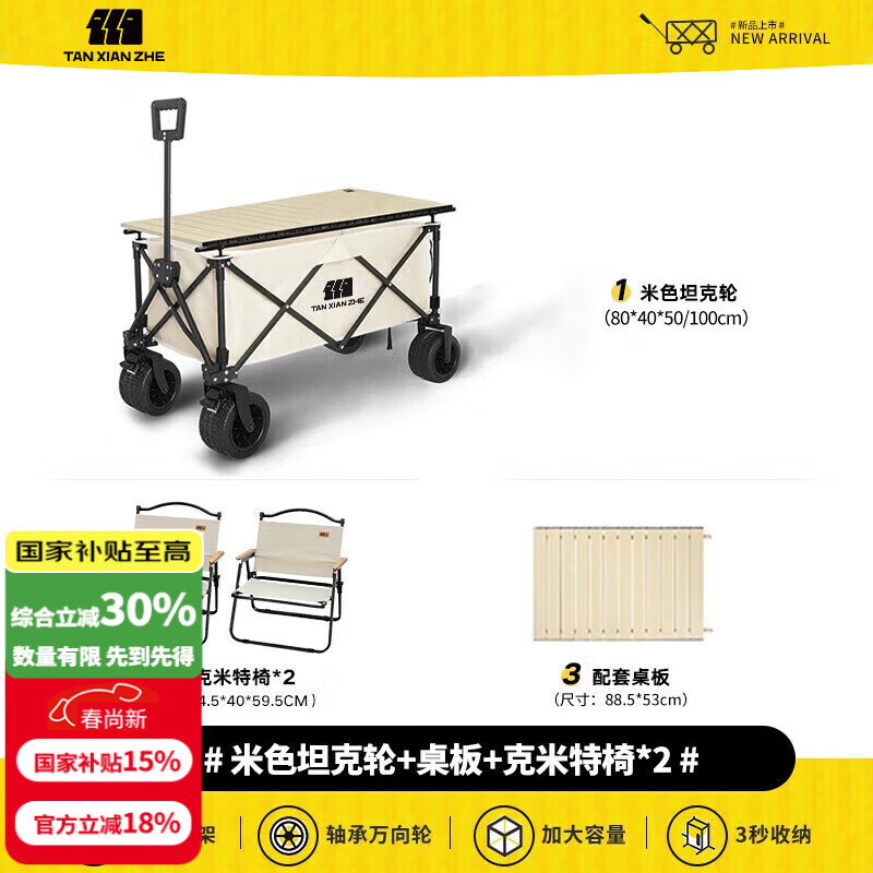 探险者露营车折叠推车户外露营儿童小推车营地车拉年货小拖车聚拢型推车 200L 珍珠白宽轮+桌板+克米特椅*2
