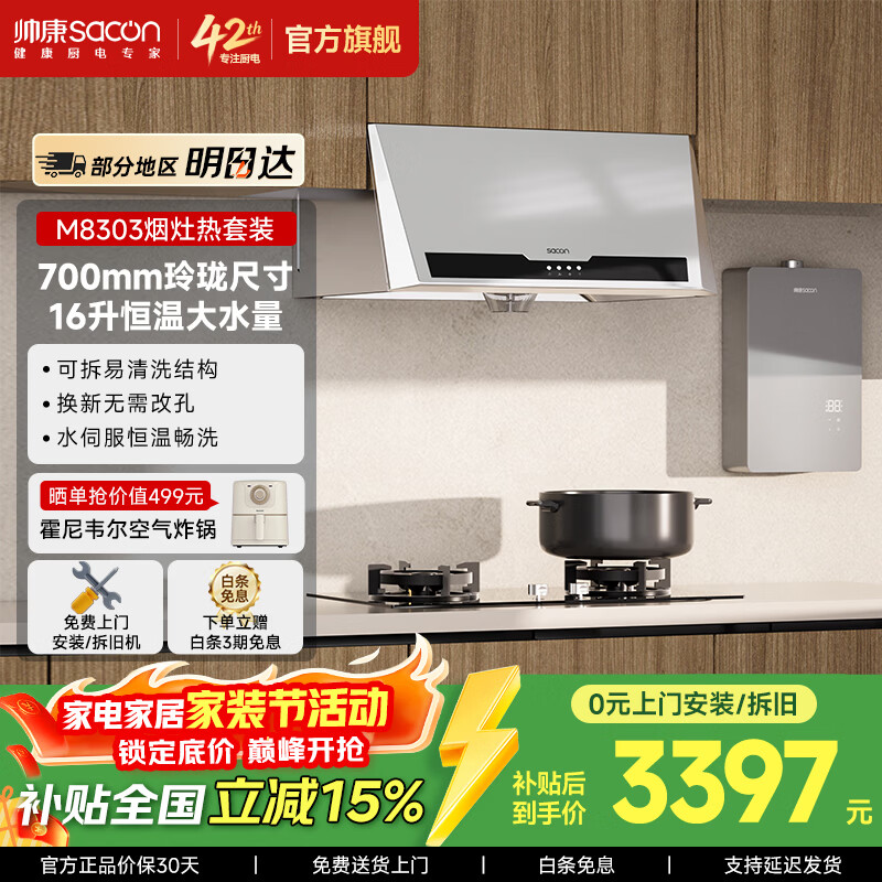帅康(Sacon)中式抽油烟机MD01 M8303【畅销口碑款】750mm小尺寸上门安装以旧换新经典老式脱排吸油烟机 M8303烟灶热三件套(3B811+16C805)