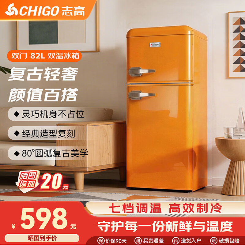 志高复古冰箱小型大容量家用租房电冰箱 化妆品网红冰箱冷藏冷冻一级能效小冰箱节能省电 【柠檬黄】82L复古冰箱【7档调温 轻奢韵味】