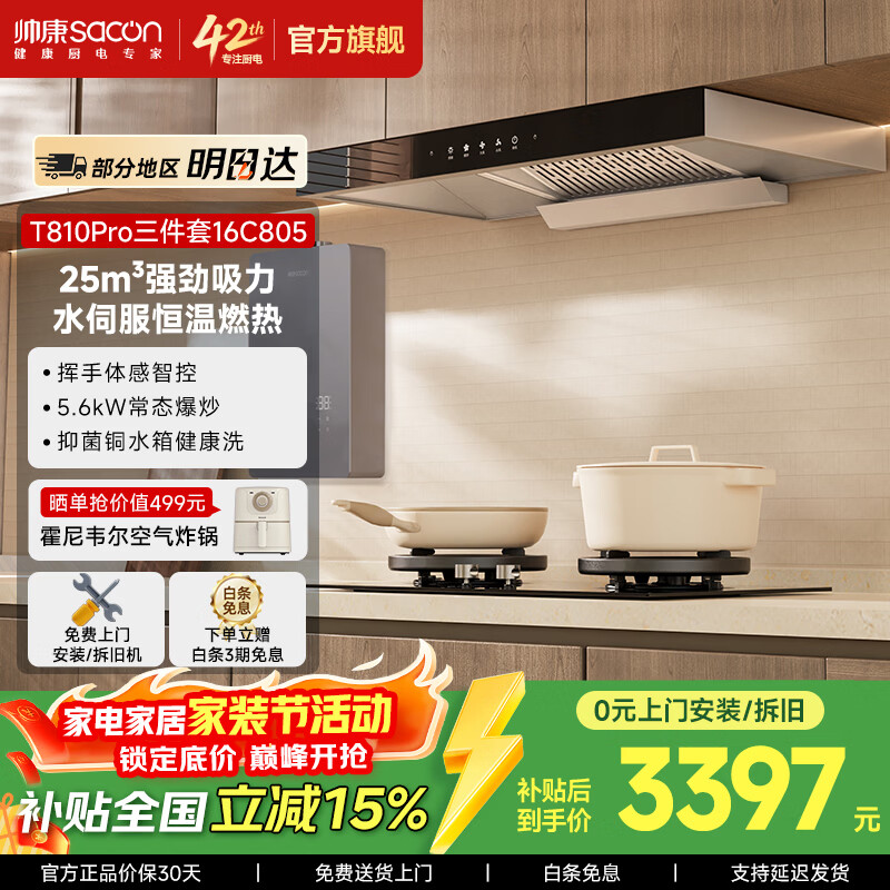 帅康(Sacon)【净界Pro】欧式顶吸式抽油烟机T810Pro T8233Pro 【特价爆款】25m³大吸力 以旧换新挥手智控 净界Pro烟灶热三件套(3B812+16C805)