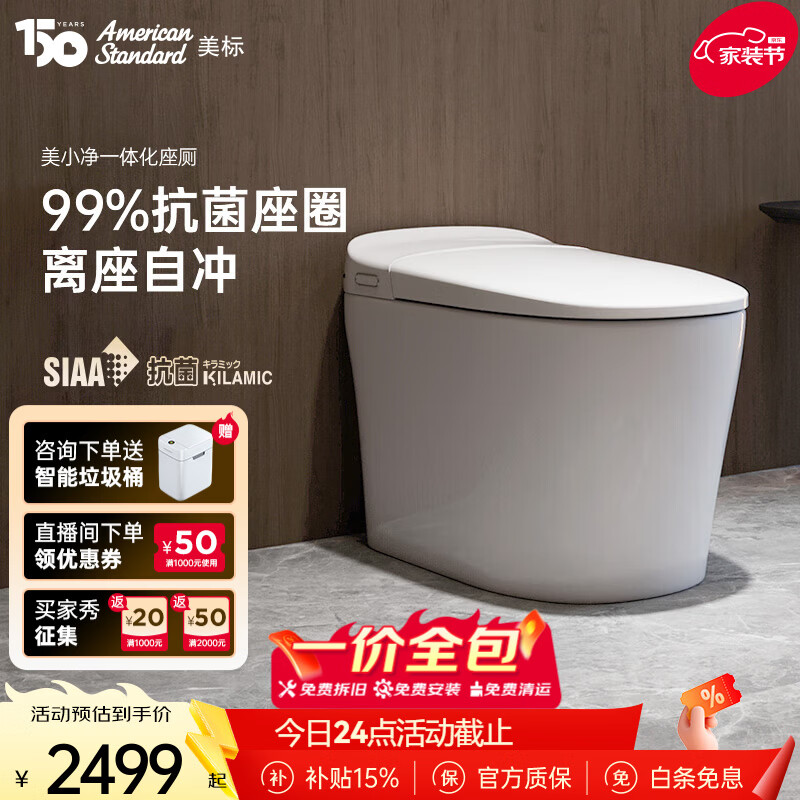 美标卫浴美小净轻智能马桶抗菌加热座圈脚踢免触自动开闭盖离座冲水 【自动冲水】美小净 400坑距 390mm及以上适用