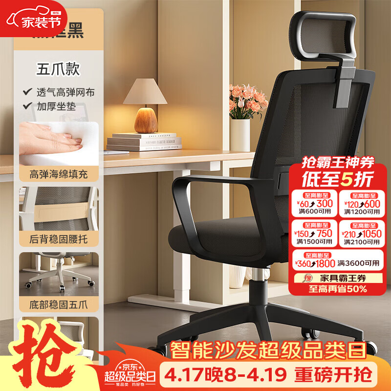 树浩电脑椅办公椅子舒适久坐靠背椅宿舍卧室学习座椅弓形电竞椅写字椅 【滑轮头枕】海绵+尼龙脚-黑框黑
