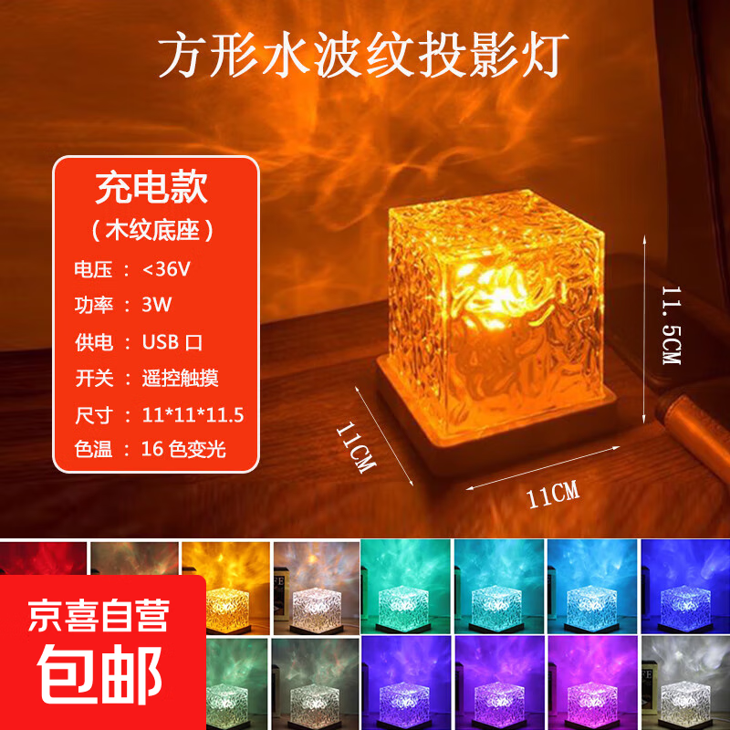 水波纹浪漫氛围灯创意情趣夫妻小夜灯卧室直播背景动态投影小台灯 充电款-高亮16色方形动态投影灯