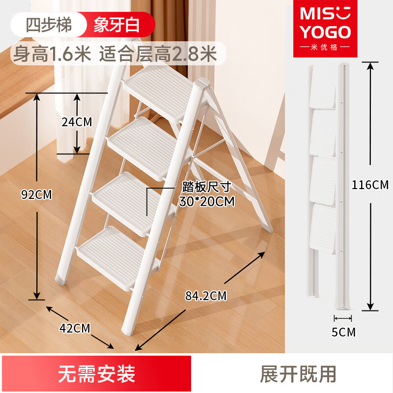 MISYOGO乔迁之喜梯子新居家用折叠多功能加厚花架置物搬家入户全红人字梯 加厚款珍珠白-四步梯