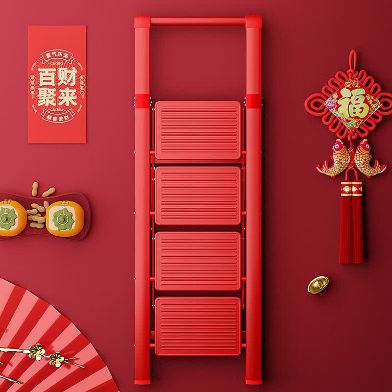 MISYOGO乔迁之喜梯子新居家用折叠多功能加厚花架置物搬家入户全红人字梯 福运款加厚红-扶手四步梯
