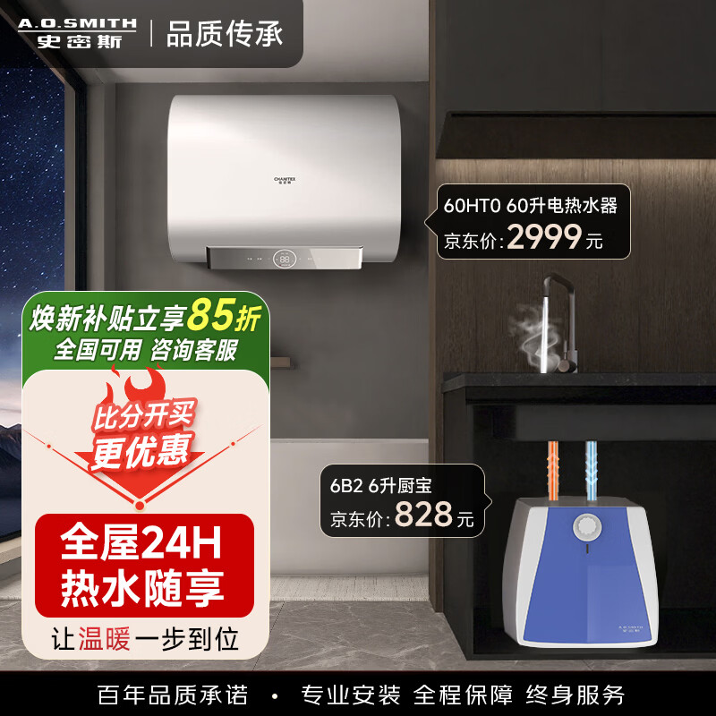 史密斯(A.O.SMITH)【国家补贴15%】银河佳尼特电热水器60升80升超薄扁桶双胆3kW速热智能保温家用洗澡一级能效HT0 6L 2000W 【购买厨宝更优惠】+6升厨宝