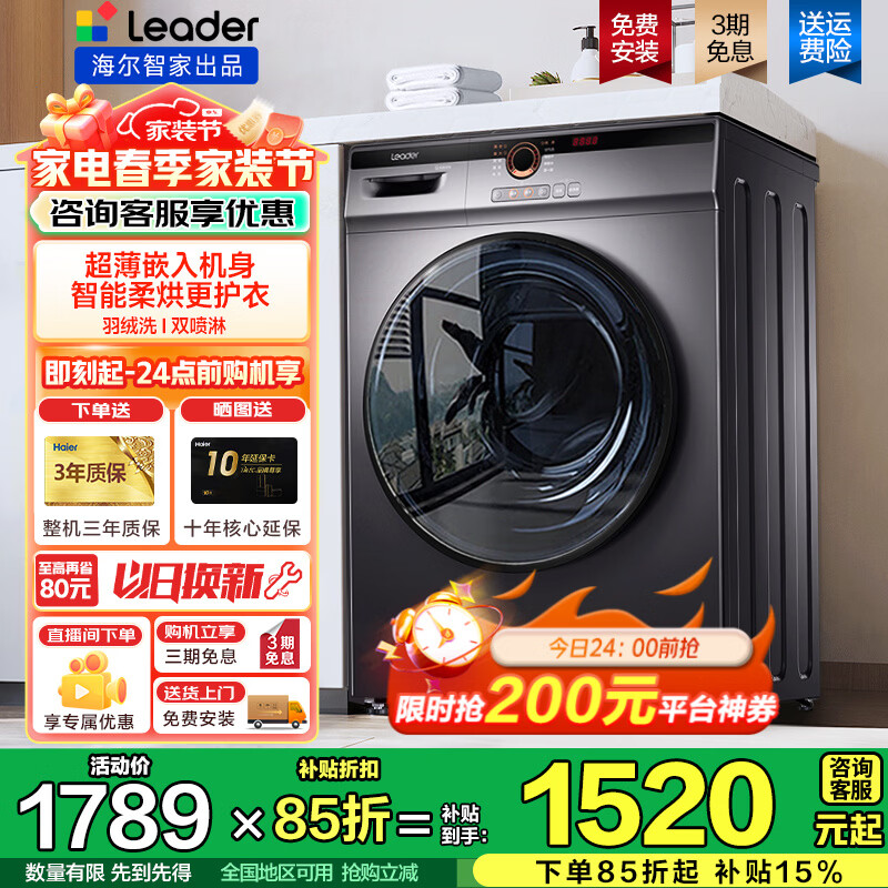 海尔(Haier)10kg全自动滚筒洗衣机大容量超薄洗衣机带烘干洗烘一体机一级能效节能除菌螨Leader 以旧换新补贴 【基础款】 滚筒洗烘 +蒸汽除菌+羽绒洗+空气洗
