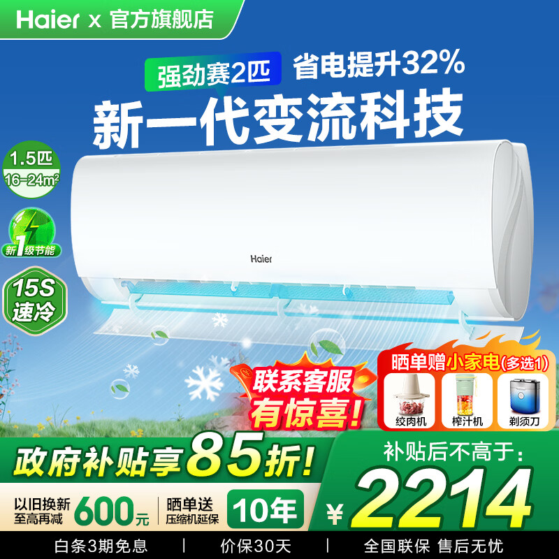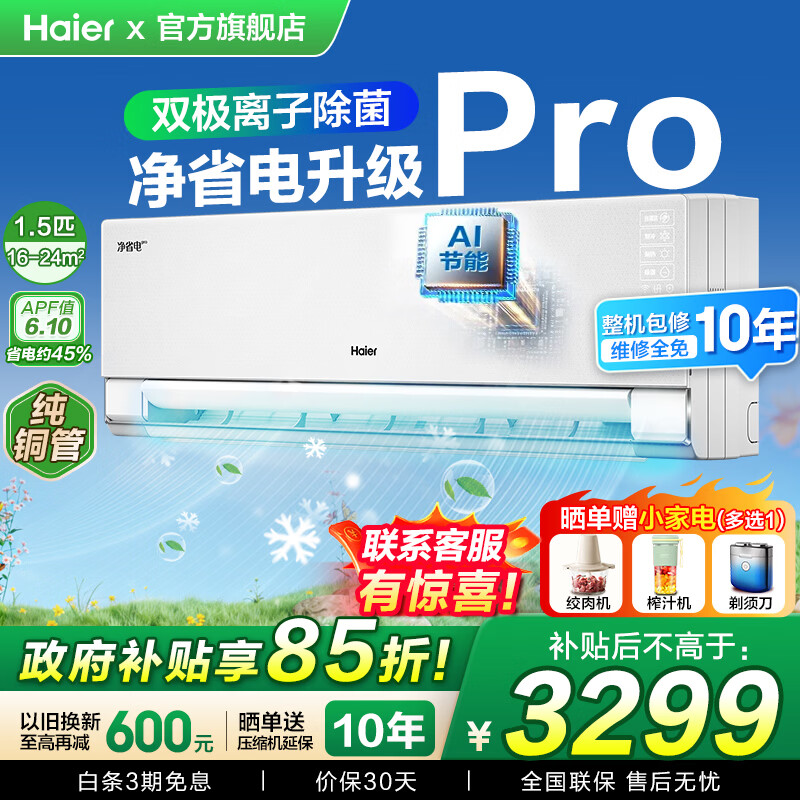 海尔空调挂机1.5匹/2匹新一级能效变频冷暖AI省电节能自清洁大风量家用卧室出租屋壁挂式空调以旧换新 1.5匹 一级能效 【净省电pro】升级双出风口