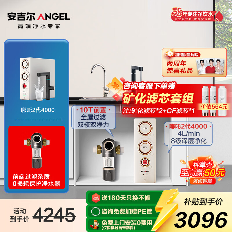 安吉尔净水器家用1600G大流速体验鲜净水机哪吒2.0真矿水4000反渗透矿物质水厨下净饮机天然矿化滤芯 哪吒2.0真矿水4000+前置3524