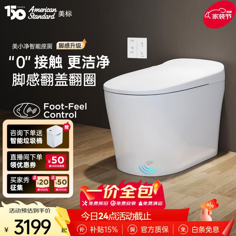 美标卫浴美小净轻智能马桶抗菌加热座圈脚踢免触自动开闭盖离座冲水 【脚感升级免触】美小净 400坑距 390mm及以上适用