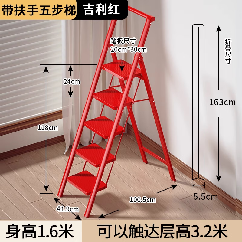 MISYOGO乔迁之喜梯子新居家用折叠多功能加厚花架置物搬家入户全红人字梯 福运款加厚红-扶手五步梯