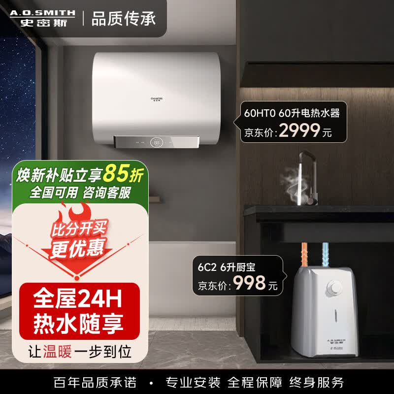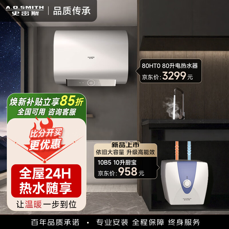 史密斯(A.O.SMITH)【国家补贴15%】银河佳尼特电热水器60升80升超薄扁桶双胆3kW速热智能保温家用洗澡一级能效HT0 10L 2000W 【购买厨宝更优惠】80升+10升