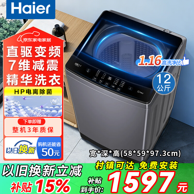海尔(Haier)洗衣机全自动波轮12公斤直驱变频一级能效智能预约抗菌除螨大容量神童洗衣机防缠绕速洗 以旧换新 【海尔】12kg直驱变频+防缠绕+精华洗+除菌 波轮