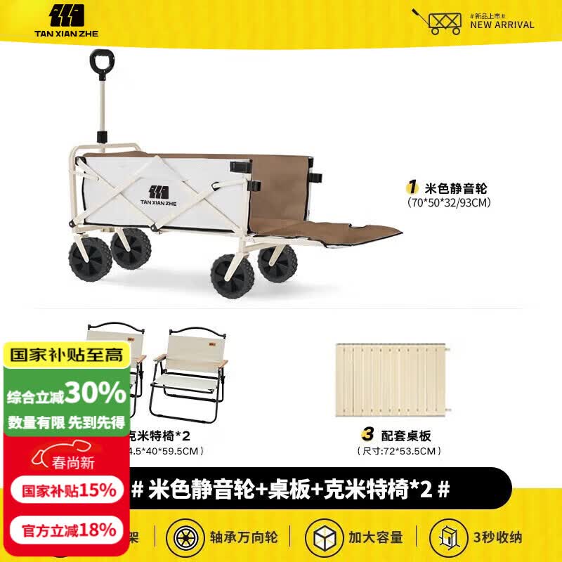 探险者露营车折叠推车户外露营儿童小推车营地车拉年货小拖车聚拢型推车 250L 云峰白窄轮+桌板+克米特椅*2