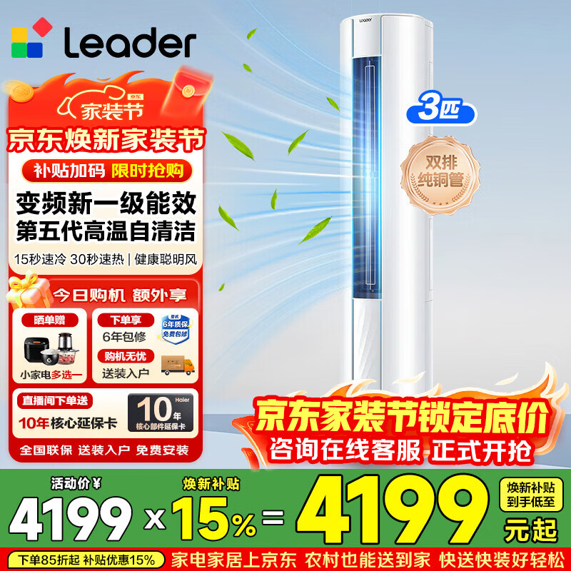 海尔空调出品大3匹变频圆柱立式柜机超省电家用空调新一级能效冷暖节能WIFI自清洁冷暖 补贴15% 3匹 一级能效 【主推款】智能聪明风