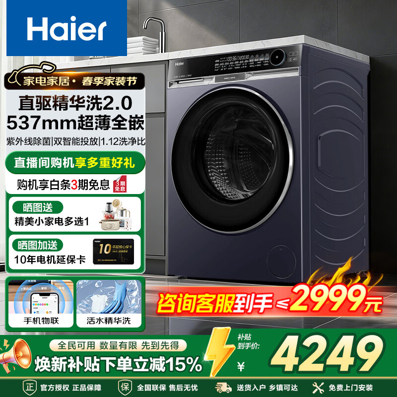 海尔(Haier)云溪4.0滚筒洗衣机10公斤超薄直驱变频滚筒洗衣机全自动大容量洗衣机BE37E活水精华洗家用蓝盾除菌 X11系列576精华洗+羊毛绿标+紫外除菌 滚筒单洗