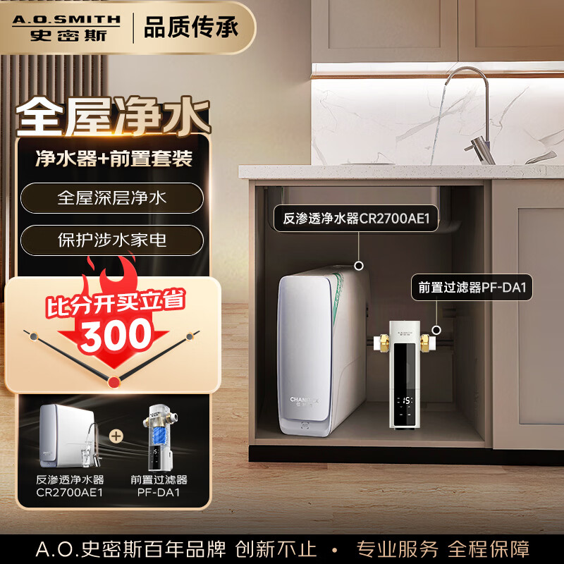 史密斯(A.O.SMITH)新品佳尼特净水器【蓝鲸3.0】家用厨下净水器直饮机净饮机专利6年RO膜蓝鲸2700升级CR2700AE1 【前置套装】净水器+前置PF-DA1 长效恒滤36吨