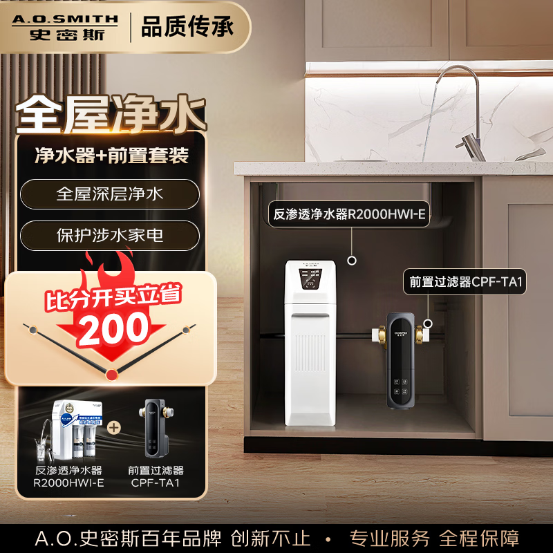 史密斯(A.O.SMITH)【央视频合作】净水器厨房专用台下用 直饮机净水机饮水机家用过滤器75%高产水率 R2000HWi-E 【前置套装】净水器+前置CPF-TA1 AI-LiNK智慧优化换芯
