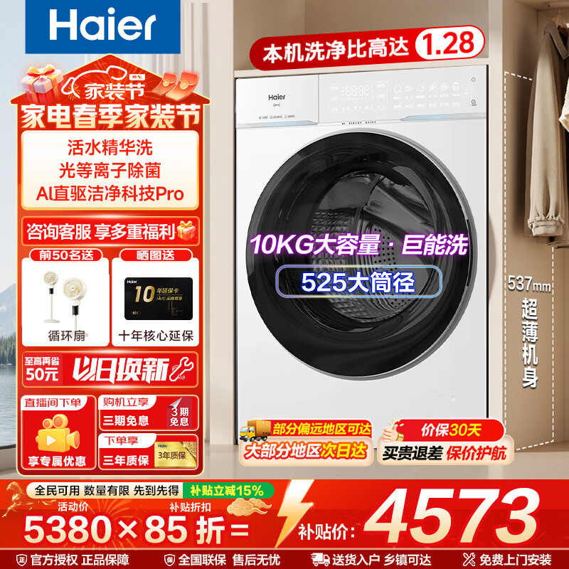 海尔(Haier)云溪4.0洗衣机77E全自动滚筒洗衣机10KG直驱超薄洗烘一体机带烘干活水精华洗羊毛绿标以旧换新补贴 【云溪4.0Pro】 滚筒单洗 精华洗+1.28洗净比