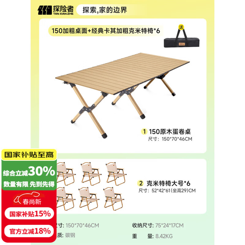 探险者(TAN XIAN ZHE)户外蛋卷桌折叠桌便携式桌椅套装露营桌子一套野餐桌装备全套摆摊 150稳固木色桌+6*经典卡其克米特椅