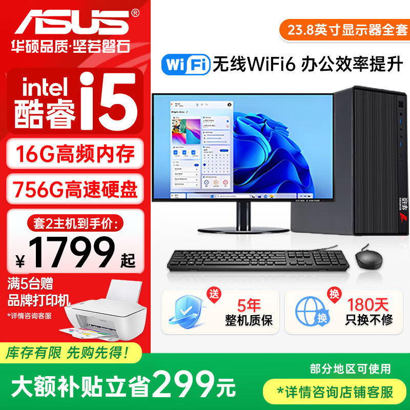 华硕(ASUS)【酷睿i5/i7】台式电脑主机独显政府商务办公家用电竞游戏设计渲染大额补贴DIY组装电脑整机全套 二:酷睿i5/16G/756G/高清办公显卡 电脑主机+27英寸显示屏全套【高清真彩屏】