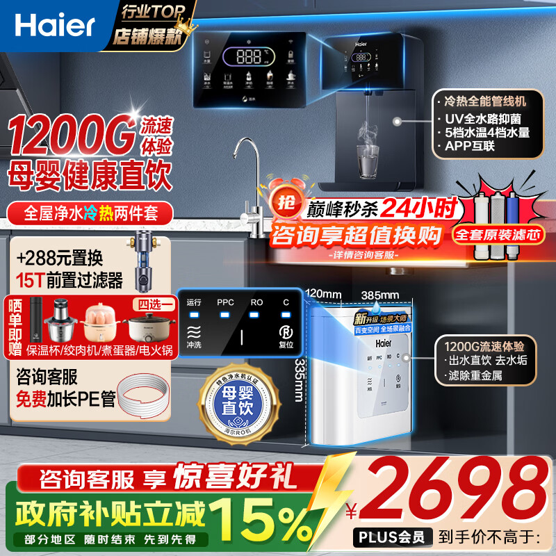 海尔(Haier)净水器家用厨下1200G流速母婴RO反渗透直饮净水机加热一体机餐边柜壁挂式管线机接自来水全屋套装 冷热管线机+净水器