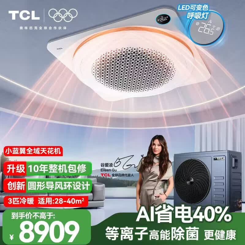 TCL吸顶空调 天花机 中央空调商用变频隐藏式吸顶式 天井机5匹嵌入式商铺办公室厂房立式柜式空调柜机 大3匹 远超一级能效【小蓝翼-AI健康天花机】