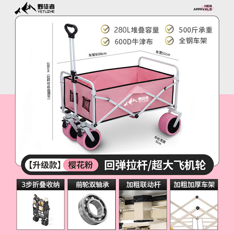 野徒者露营车户外推车野餐车儿童可躺露营装备折叠摆摊营地车小买菜车 樱花粉-16寸【飞机轮】 升级加粗全钢车架