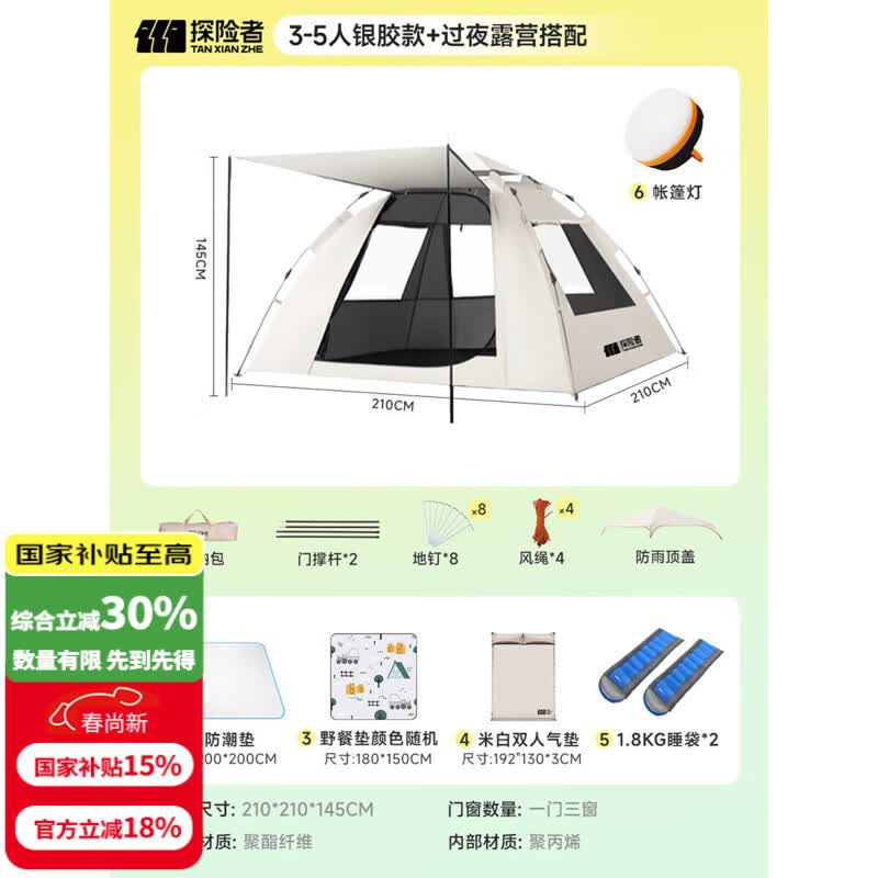 探险者帐篷户外露营防雨过夜3人-4人便携式折叠露营帐篷全自动加厚防晒 3-5人银胶款+过夜露营搭配
