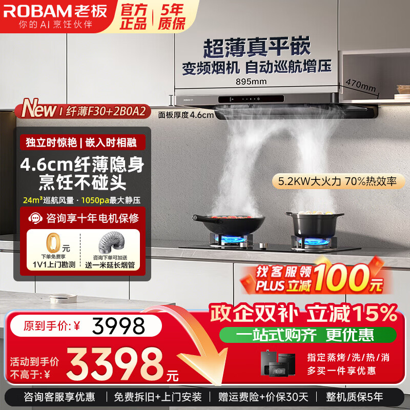老板(Robam)【升级款F30】60A0S油烟机燃气灶套装 家用欧式顶吸直流变频巡航24大风量烟机灶具套装 以旧换新 【升级省气】F30+70%热效率猛火2B0A2