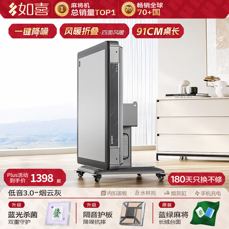 如喜【防侧翻20万次不卡牌】麻将机全自动餐桌低音家两用一体折叠电动 18【迷你91cm桌长】低音3.0一键降噪-风暖脚-烟云灰 请联系客服选择麻将牌大小