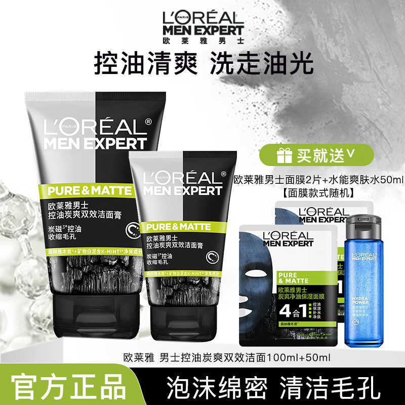 欧莱雅男士洗面奶补水保湿控油碳爽磨砂抗黑头深层净化氨基酸洁面膏乳 控油炭爽双效洁面100ml+50ml面膜