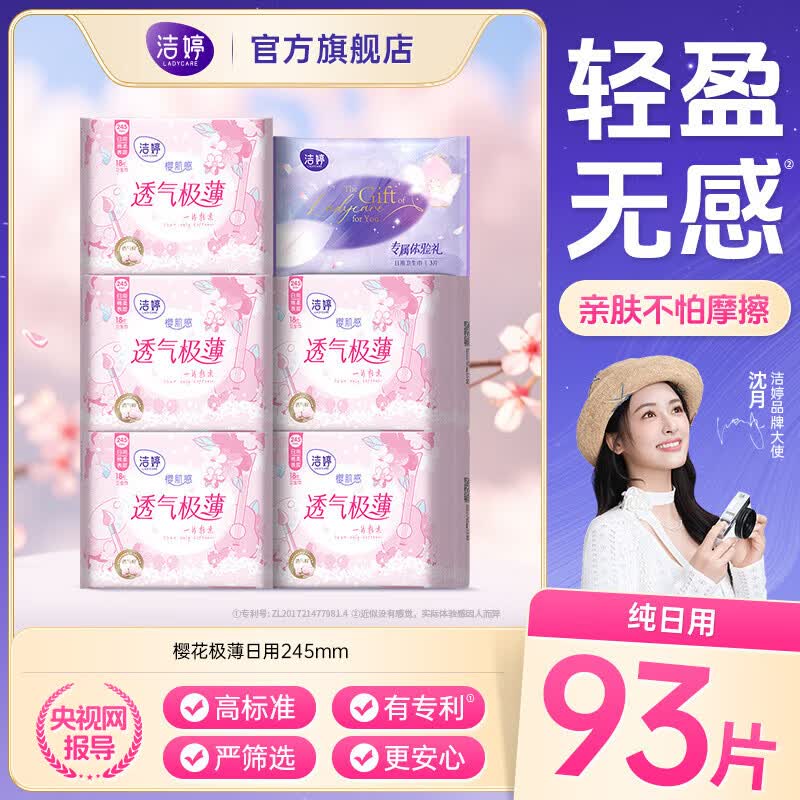 洁婷绵柔卫生巾透气双U日夜用姨妈巾组合套装 樱花纯日用93片