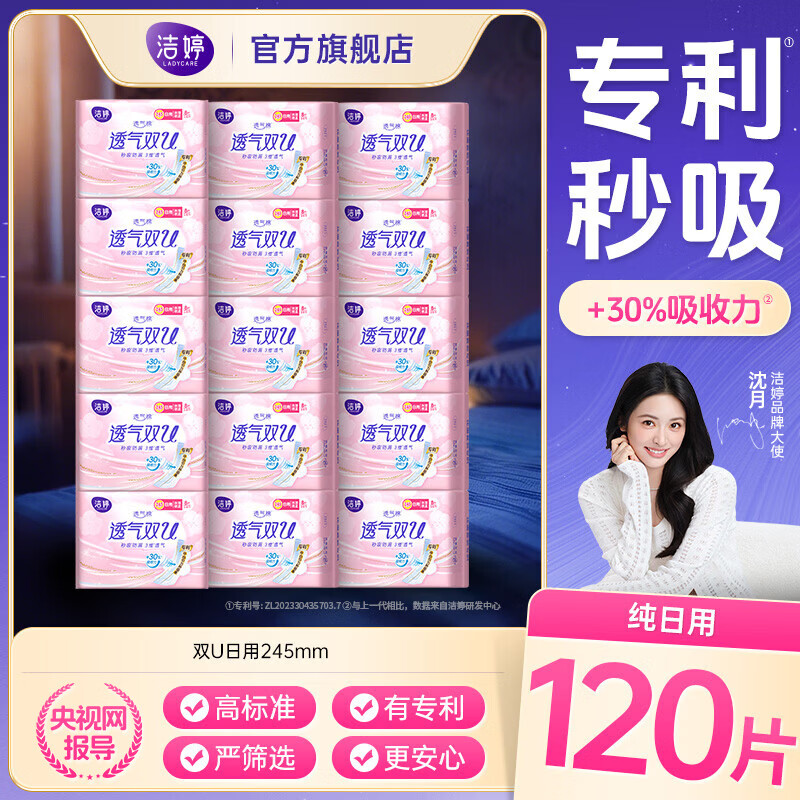 洁婷绵柔卫生巾透气双U日夜用姨妈巾组合套装 双u纯日用组合120片