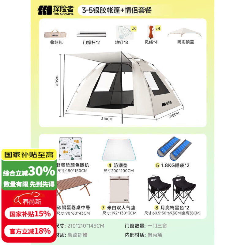 探险者帐篷户外露营防雨过夜3人-4人便携式折叠露营帐篷全自动加厚防晒 3-5银胶帐篷+情侣套餐