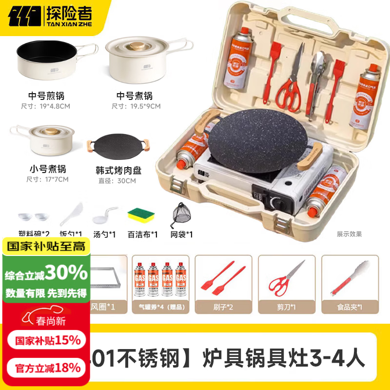 探险者卡式炉户外卡式炉具套装防爆卡磁炉全套带锅烤盘露营野餐烧烤卡斯 【升级401不锈钢】炉具锅具灶3-4人