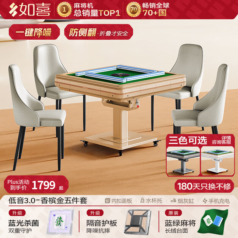 如喜【防侧翻20万次不卡牌】麻将机全自动餐桌低音家两用一体折叠电动 52【配餐椅】低音3.0一键降噪-防侧翻-金(三色可选) 请联系客服选择麻将牌大小