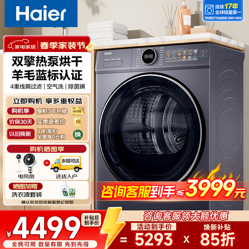 海尔(Haier)云溪37E/77E/579/27E/58E热泵烘干机家用10公斤干衣机空气洗衣物护理机除菌螨4重净虑 以旧换新 云溪4.0干衣机77E【上方链接无货时可拍此链接】