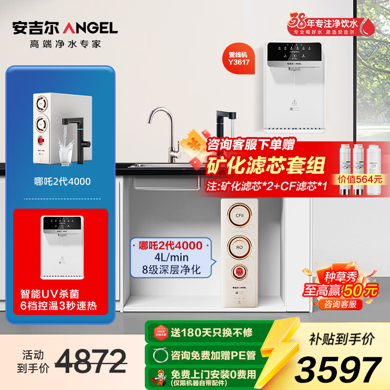 安吉尔净水器家用直饮机1600G大流速体验鲜矿水净水机哪吒2代4000反渗透矿物质水厨下净饮机天然矿化滤芯 哪吒2.0真矿水4000+管线机3617