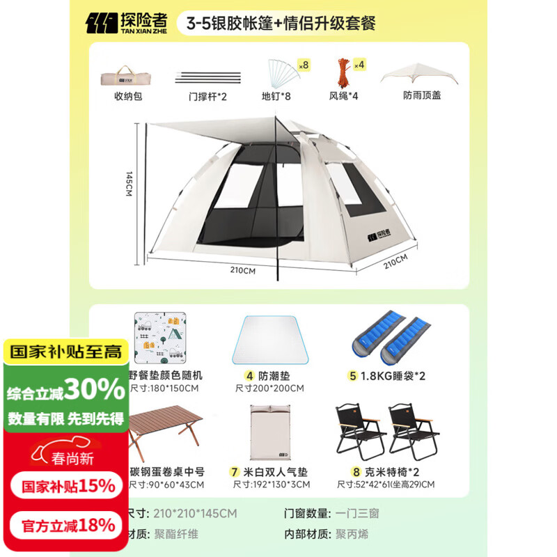 探险者帐篷户外露营防雨过夜3人-4人便携式折叠露营帐篷全自动加厚防晒 3-5银胶帐篷+情侣升级套餐