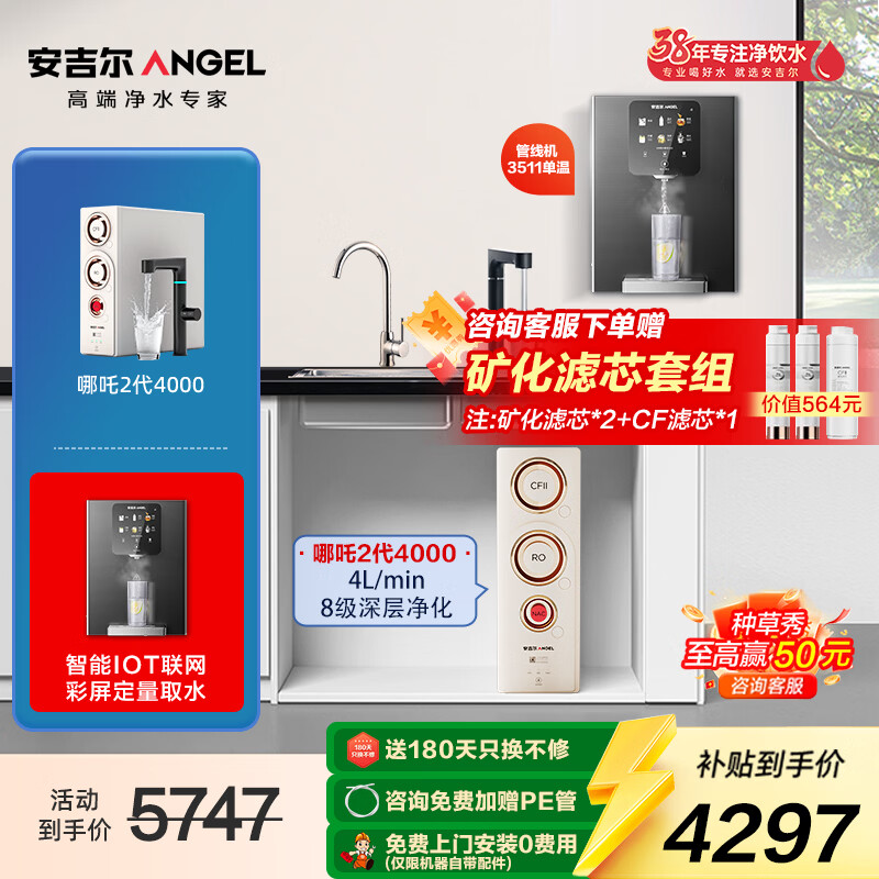 安吉尔净水器家用直饮机1600G大流速体验鲜矿水净水机哪吒2代4000反渗透矿物质水厨下净饮机天然矿化滤芯 哪吒2.0真矿水4000+管线机3511(单温)