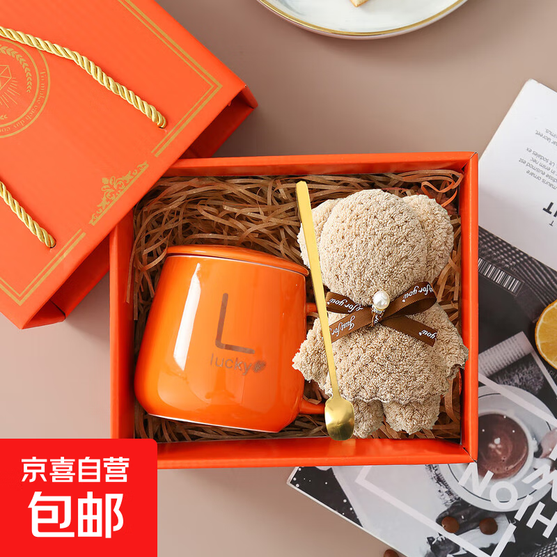 杯子伴手礼套装陶瓷马克水杯开业年会新年结婚礼盒送人实用礼品 橙色毛巾熊套装(高温烤花不掉色) 400毫升