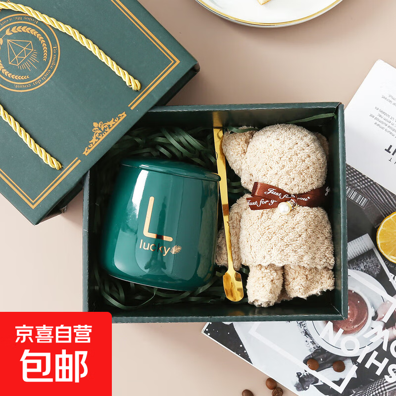 杯子伴手礼套装陶瓷马克水杯开业年会新年结婚礼盒送人实用礼品 绿色毛巾熊套装(高温烤花不掉色) 400毫升