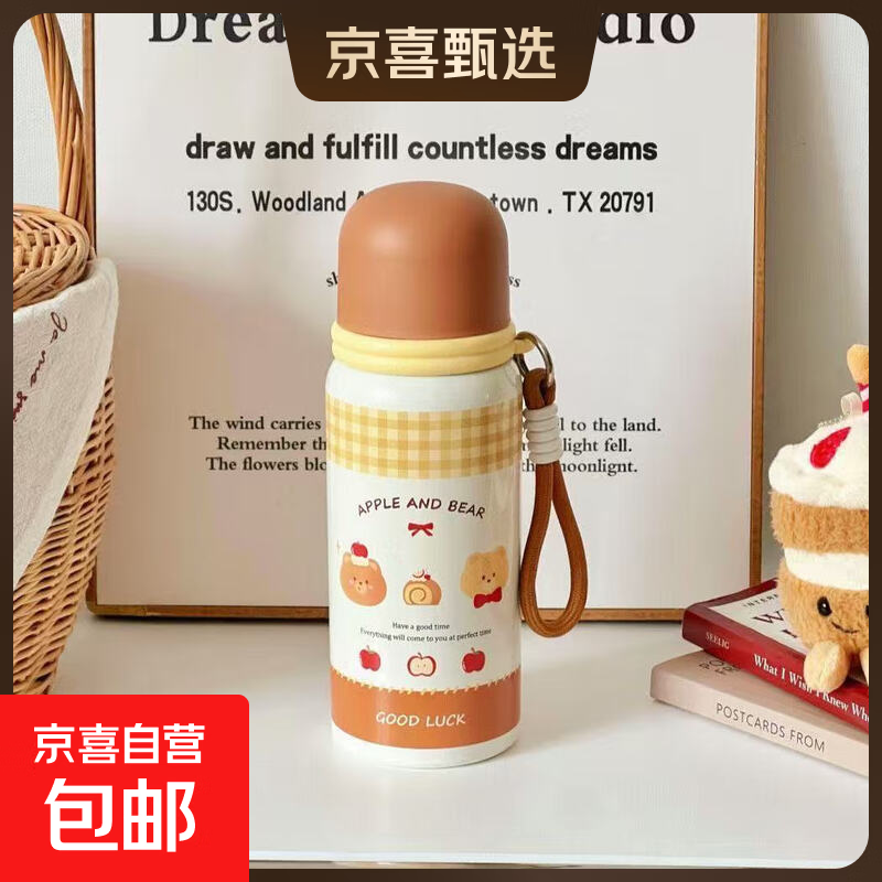 可爱吸管保温杯不锈钢高颜值儿童女生水杯便携ins风学生喝水杯子 咖色