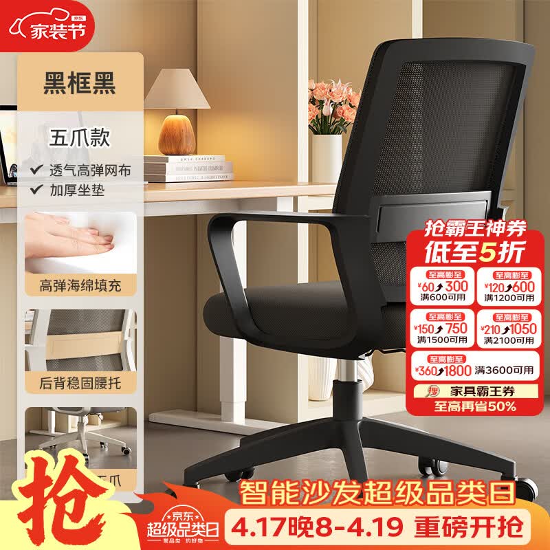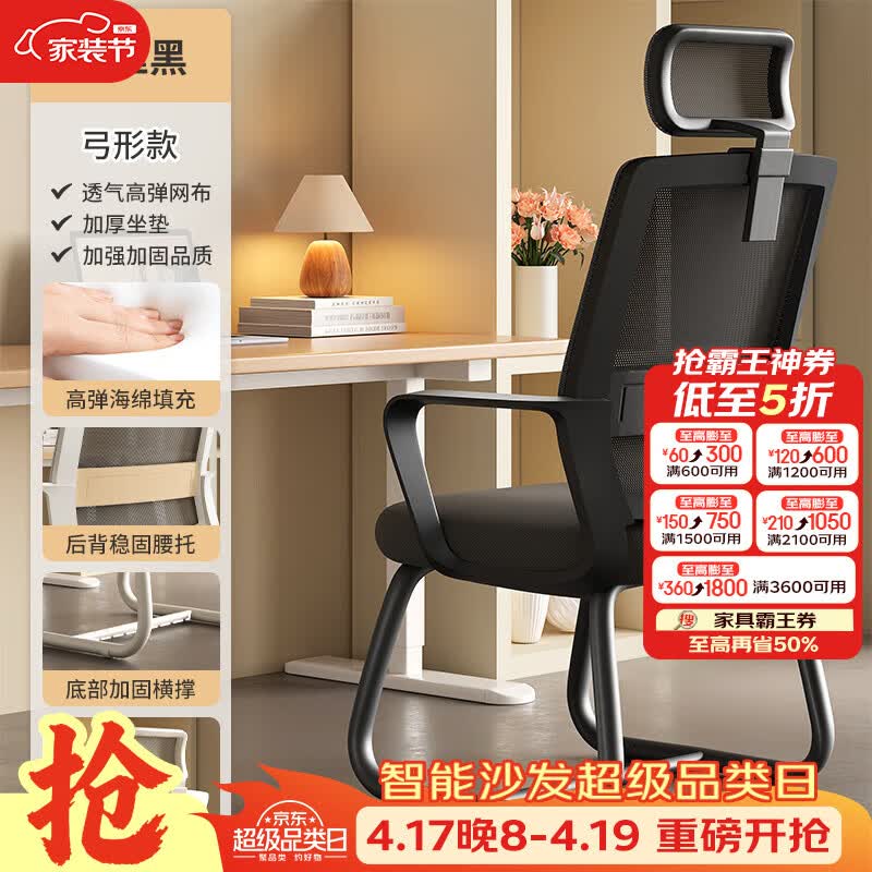 树浩电脑椅办公椅子舒适久坐靠背椅宿舍卧室学习座椅弓形电竞椅写字椅 【滑轮】海绵+尼龙脚-黑框黑网