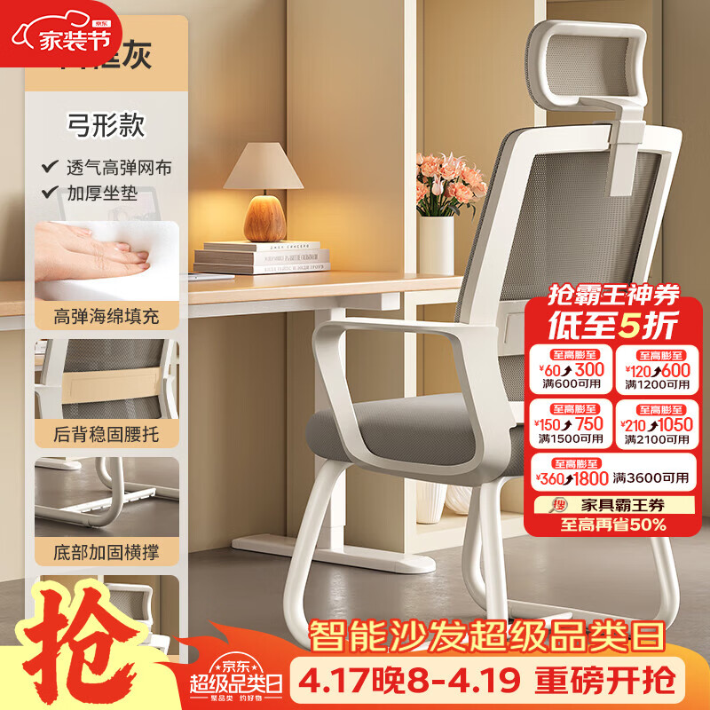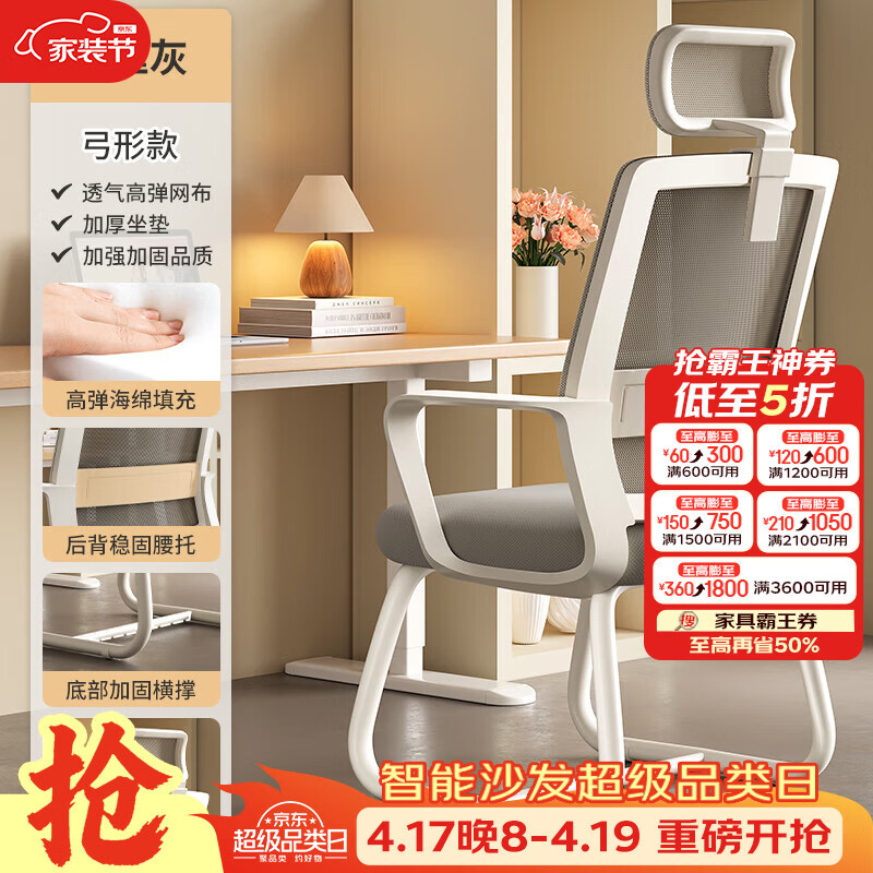 树浩电脑椅办公椅子舒适久坐靠背椅宿舍卧室学习座椅弓形电竞椅写字椅 【弓形头枕款】海绵款-白框灰网