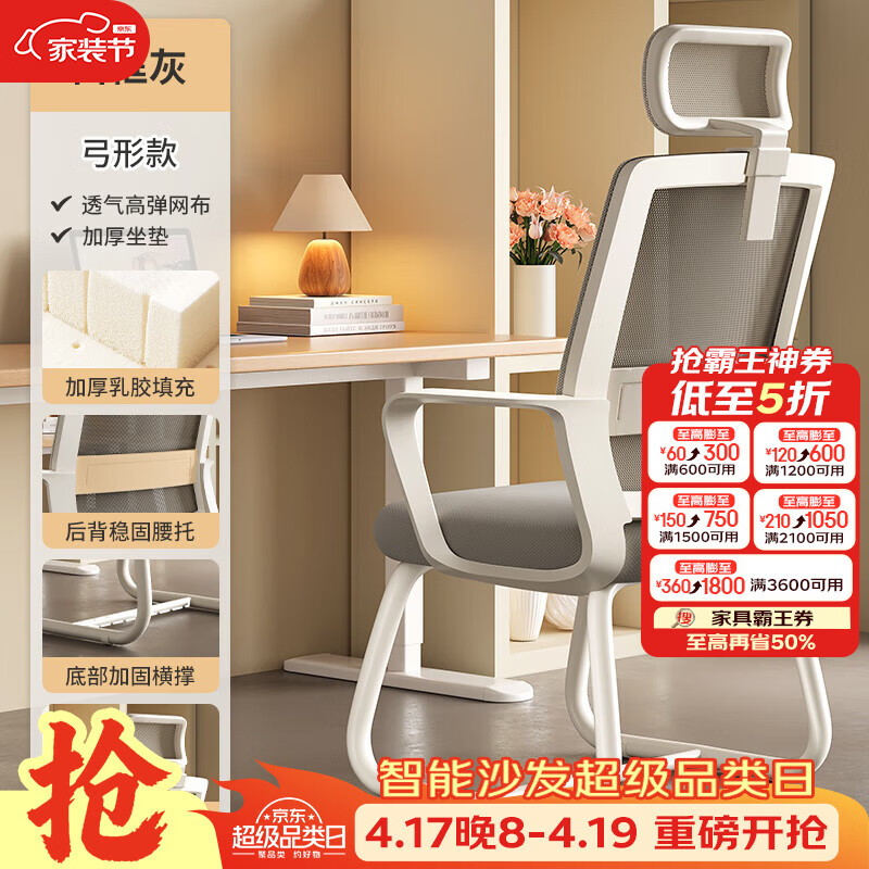 树浩电脑椅办公椅子舒适久坐靠背椅宿舍卧室学习座椅弓形电竞椅写字椅 【弓形头枕款】乳胶款-白框灰网
