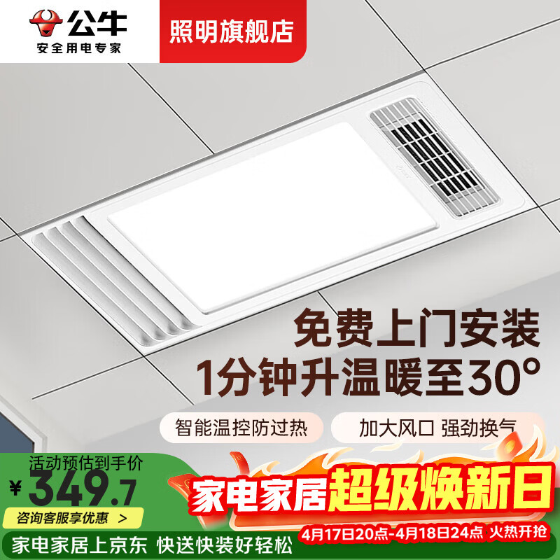 公牛(BULL)风暖浴霸300x600式照明吹风排气多功能一体卫生间集成吊顶浴室灯 送免费安装 适用非集成吊顶 免费上门安装收到货后请联系客服