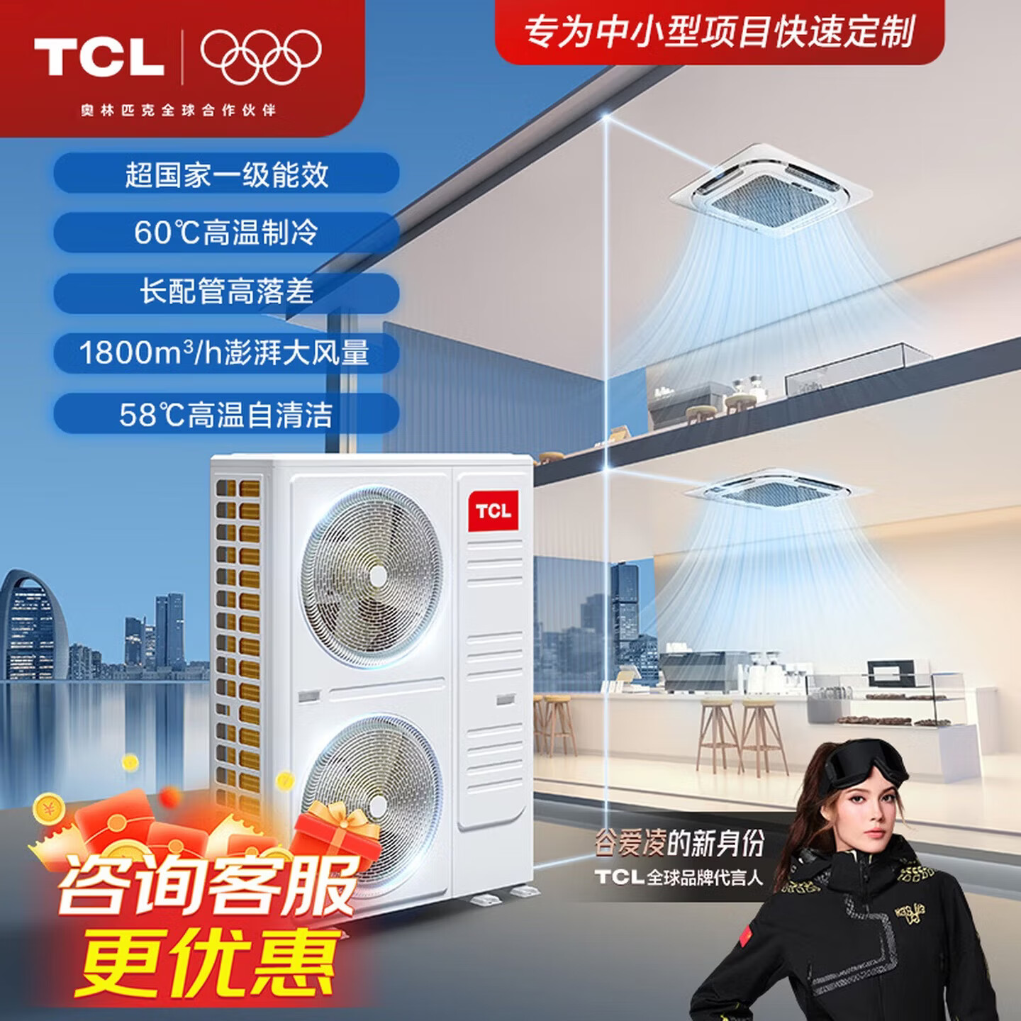 TCL吸顶空调 天花机 中央空调商用变频隐藏式吸顶式 天井机5匹嵌入式商铺办公室厂房立式柜式空调柜机 10匹 冷暖-全直流变频新一级能效【一拖二天花机】