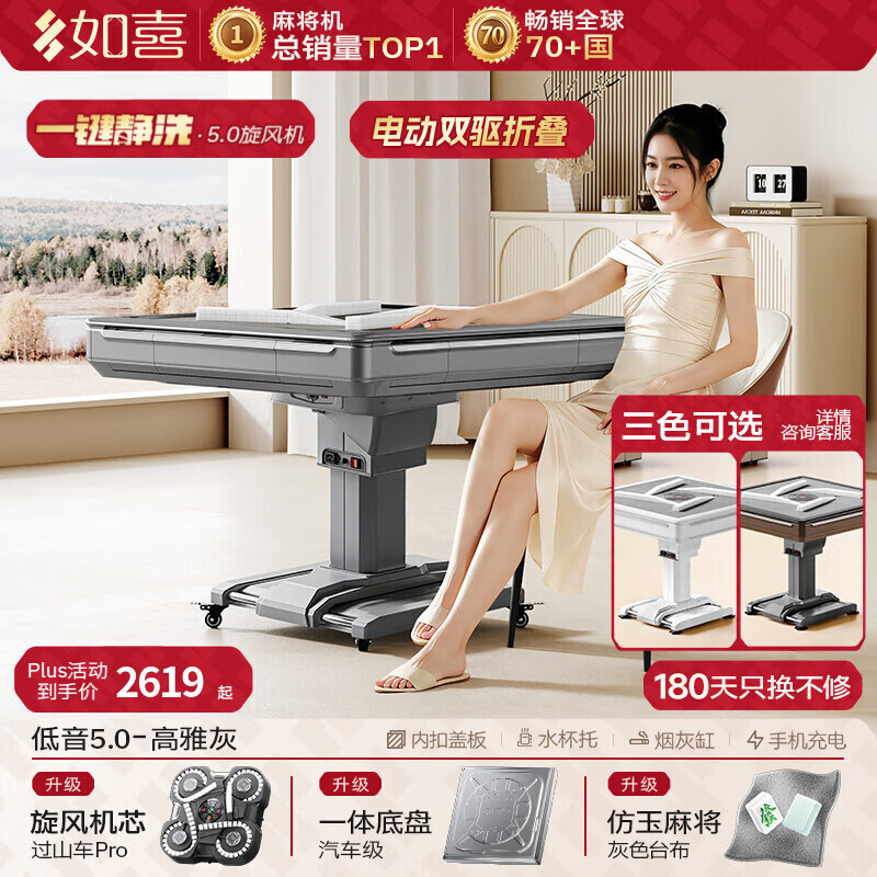 如喜【防侧翻20万次不卡牌】麻将机全自动餐桌低音家两用一体折叠电动 51【低音旋风5.0】双驱电动折叠-仿玉-灰(3色可选) 请联系客服选择麻将牌大小